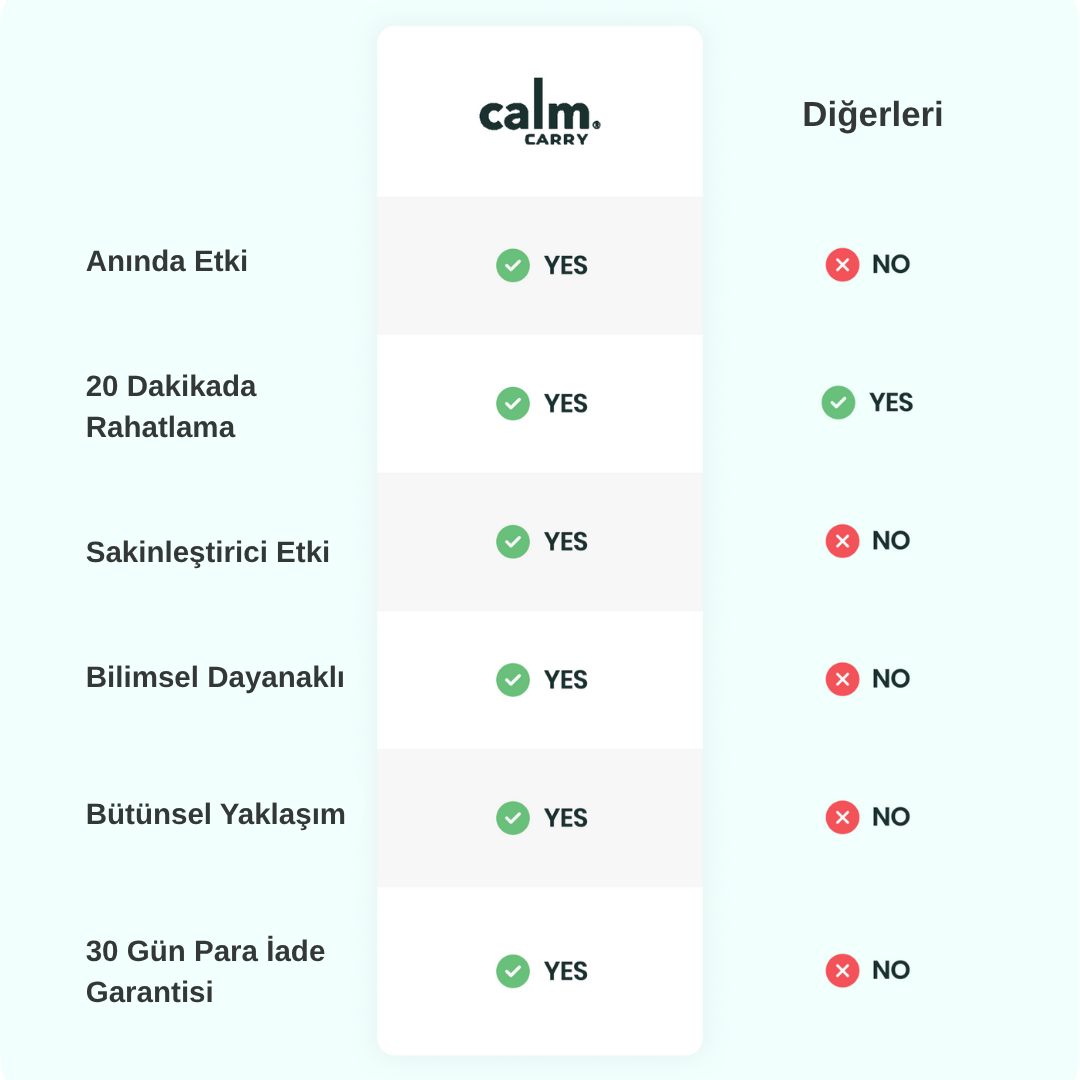 Pahalı ya da kullanımı zor yöntemlerin aksine, CalmCarry®; doğal, taşınabilir ve gerçek anlamda işe yarayan bir rahatlama ve uyku çözümü arayanlar için özel olarak geliştirildi.